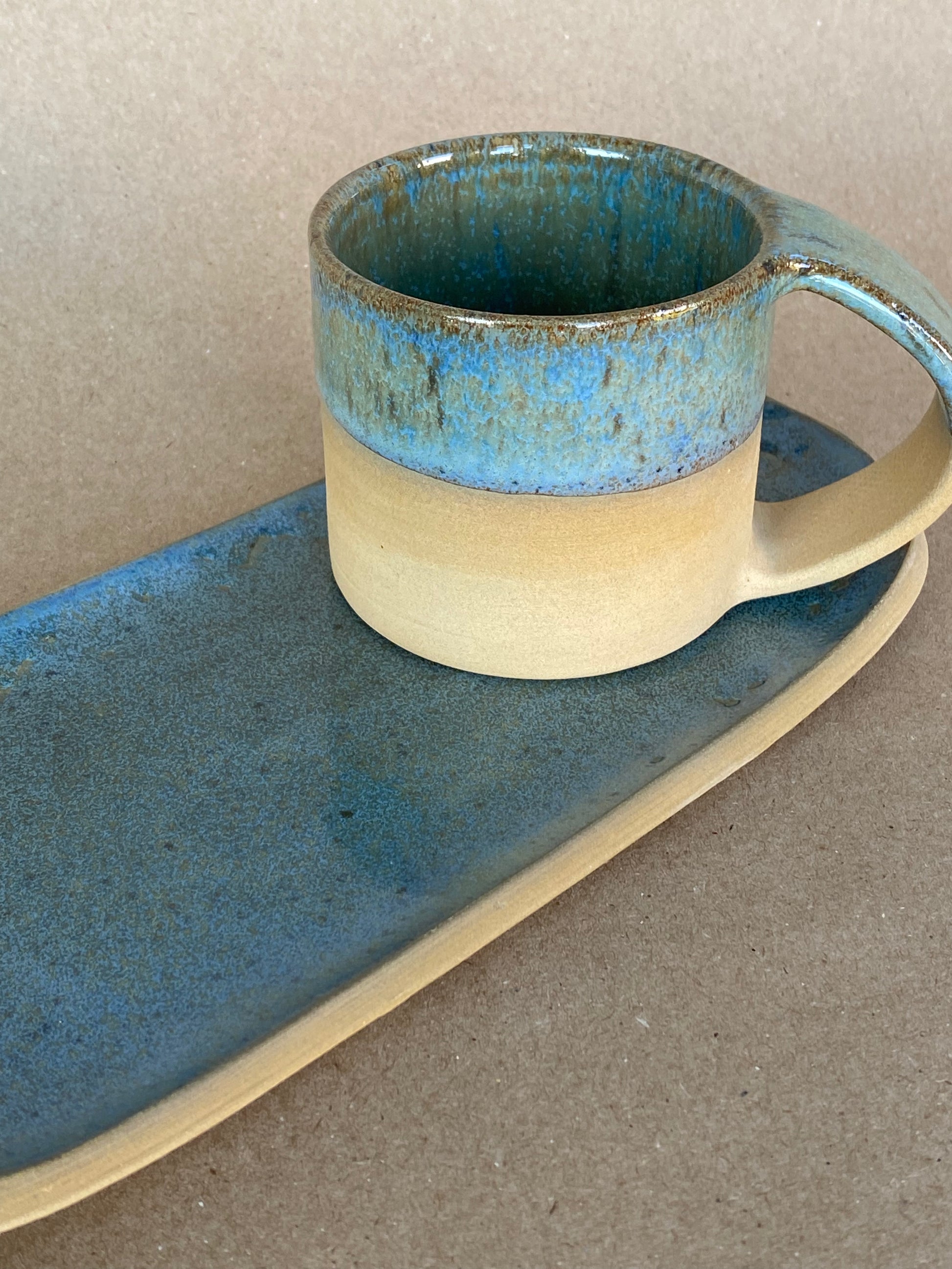 Bandejita en gres tostado y esmalte artesanal color azul con todos marrones.