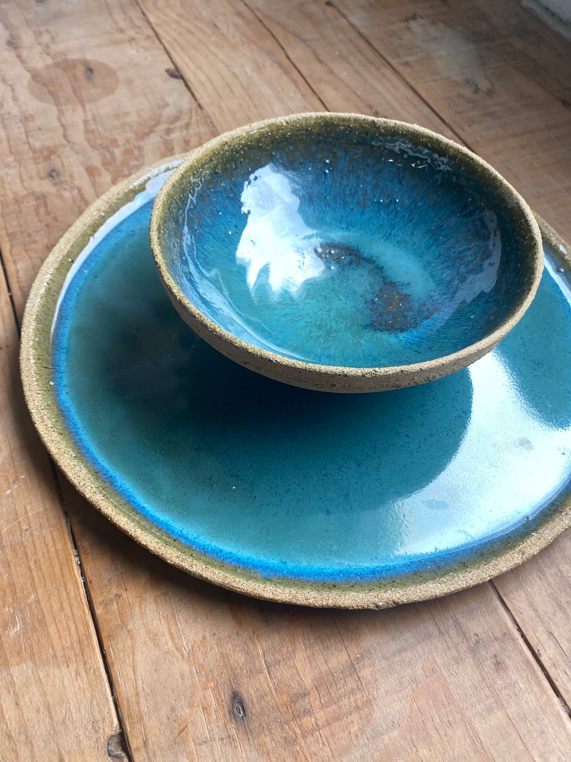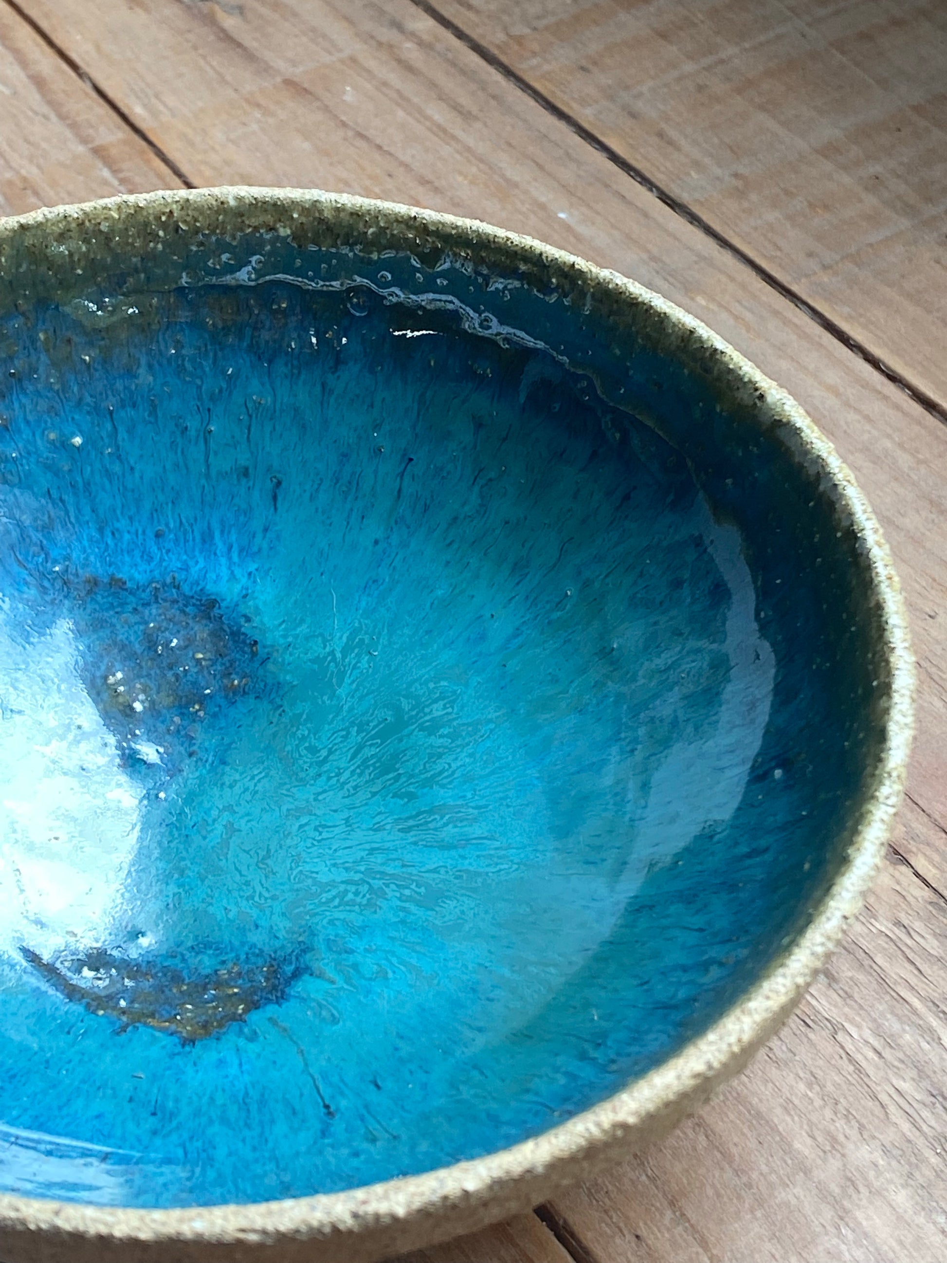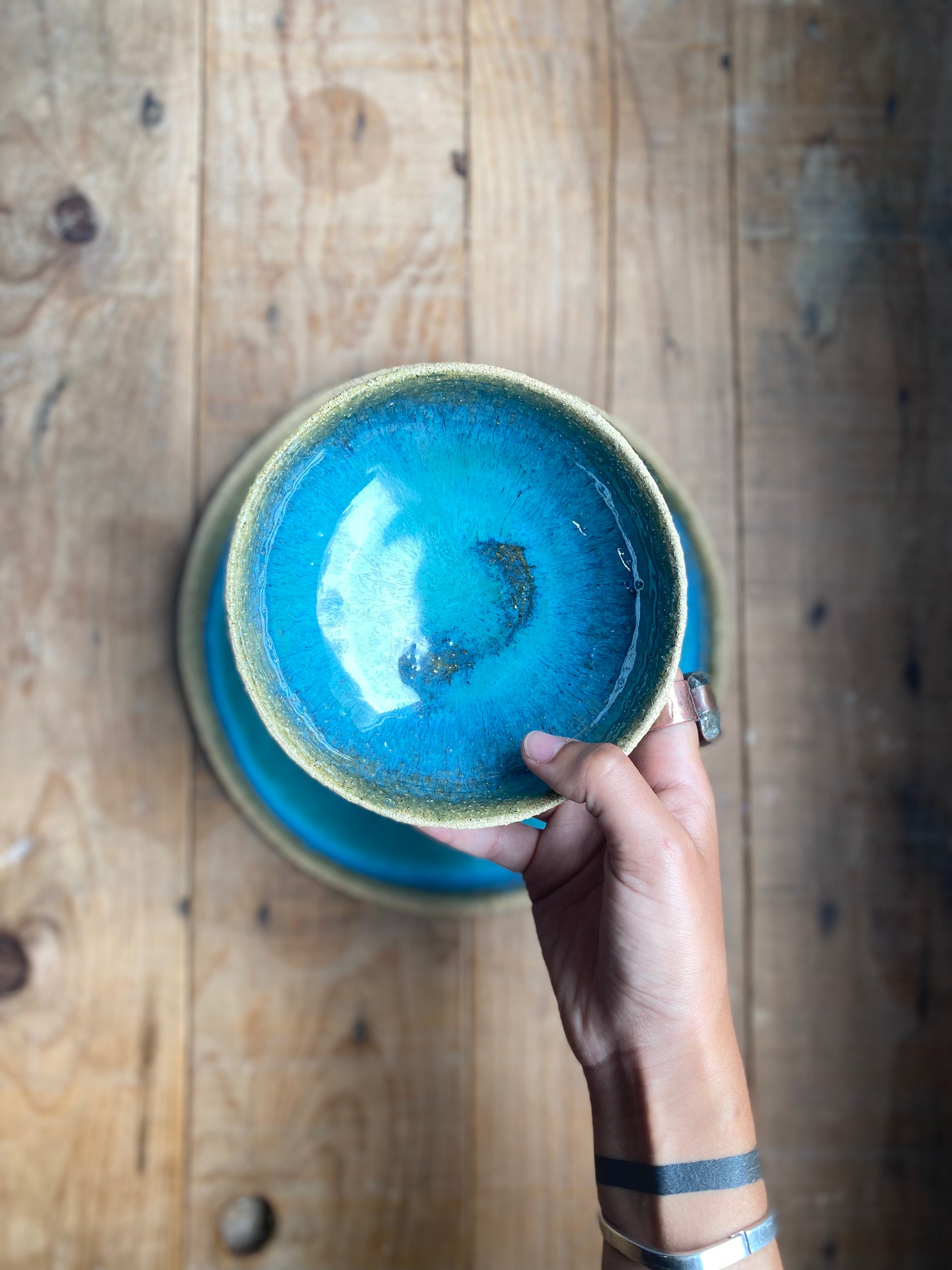 Bol mediano hecho a mano en gres claro con textura rugosa. Combínalo con el plato turquesa.