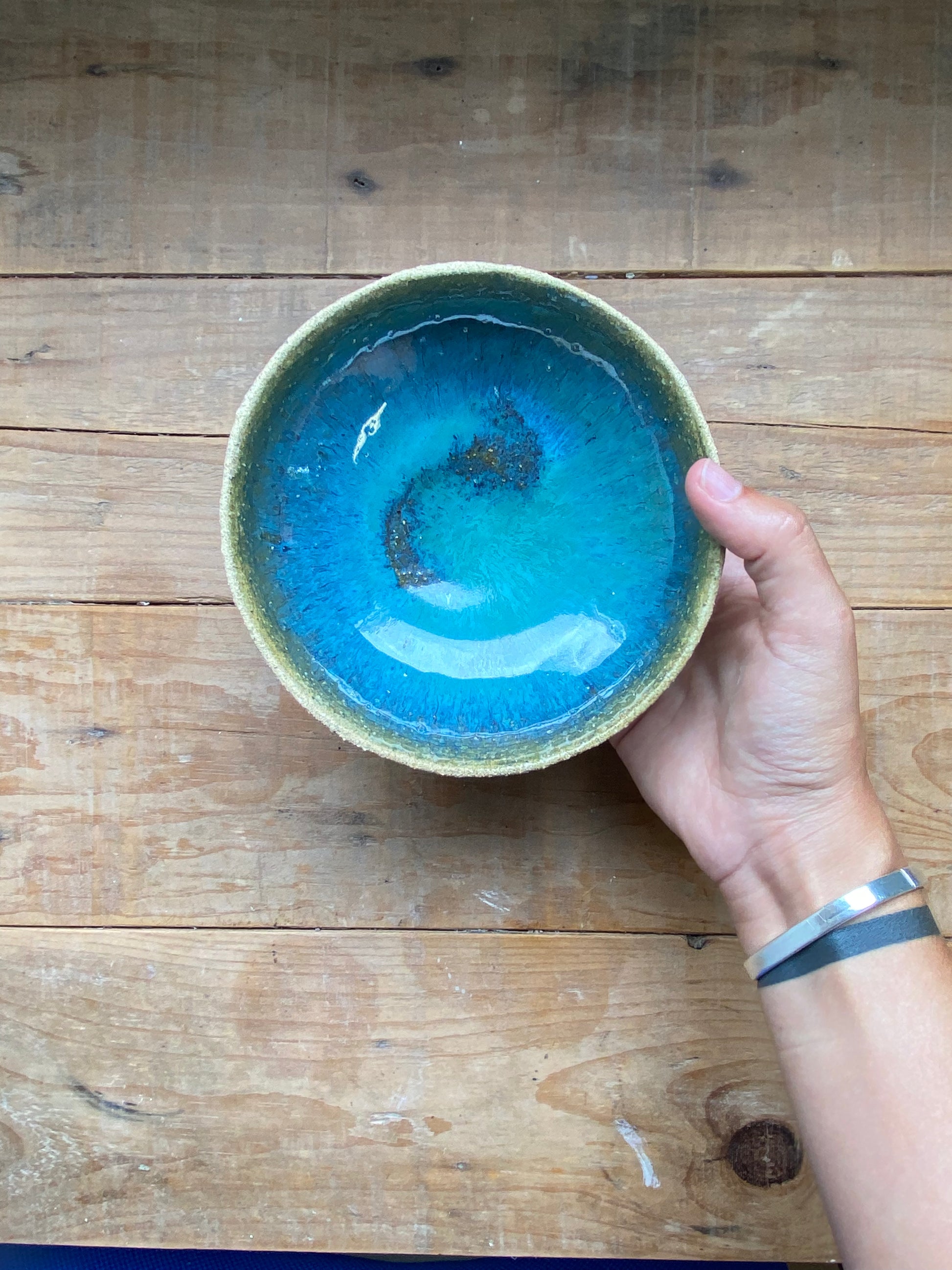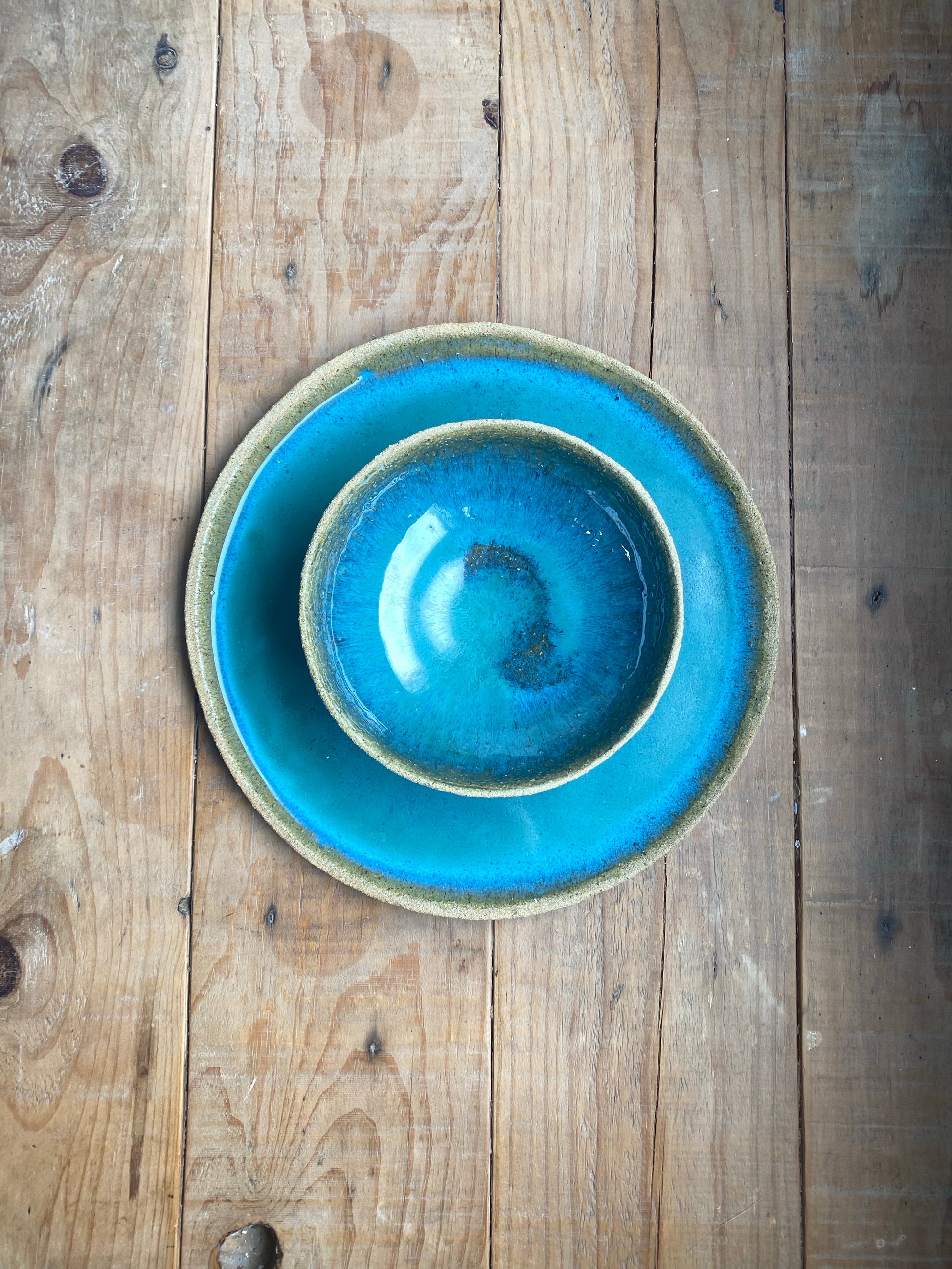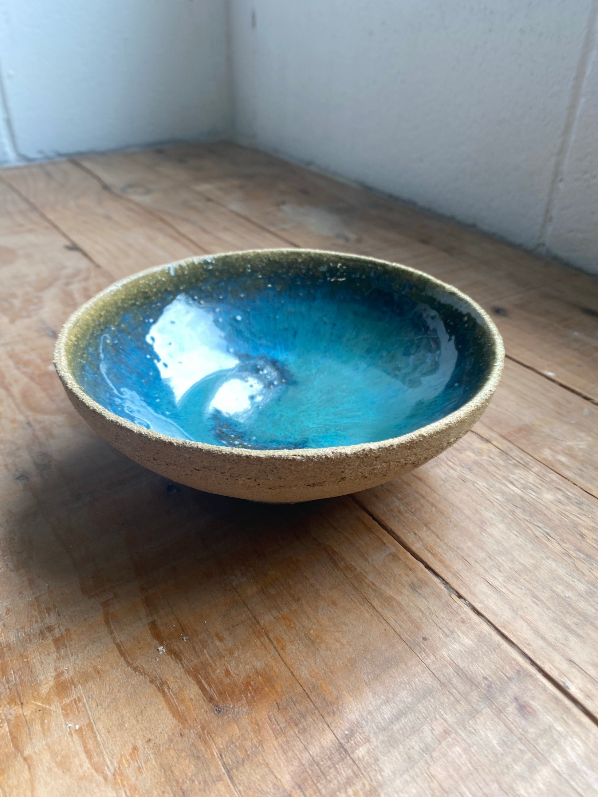 Bol mediano hecho a mano en gres claro con textura rugosa. Combínalo con el plato turquesa.