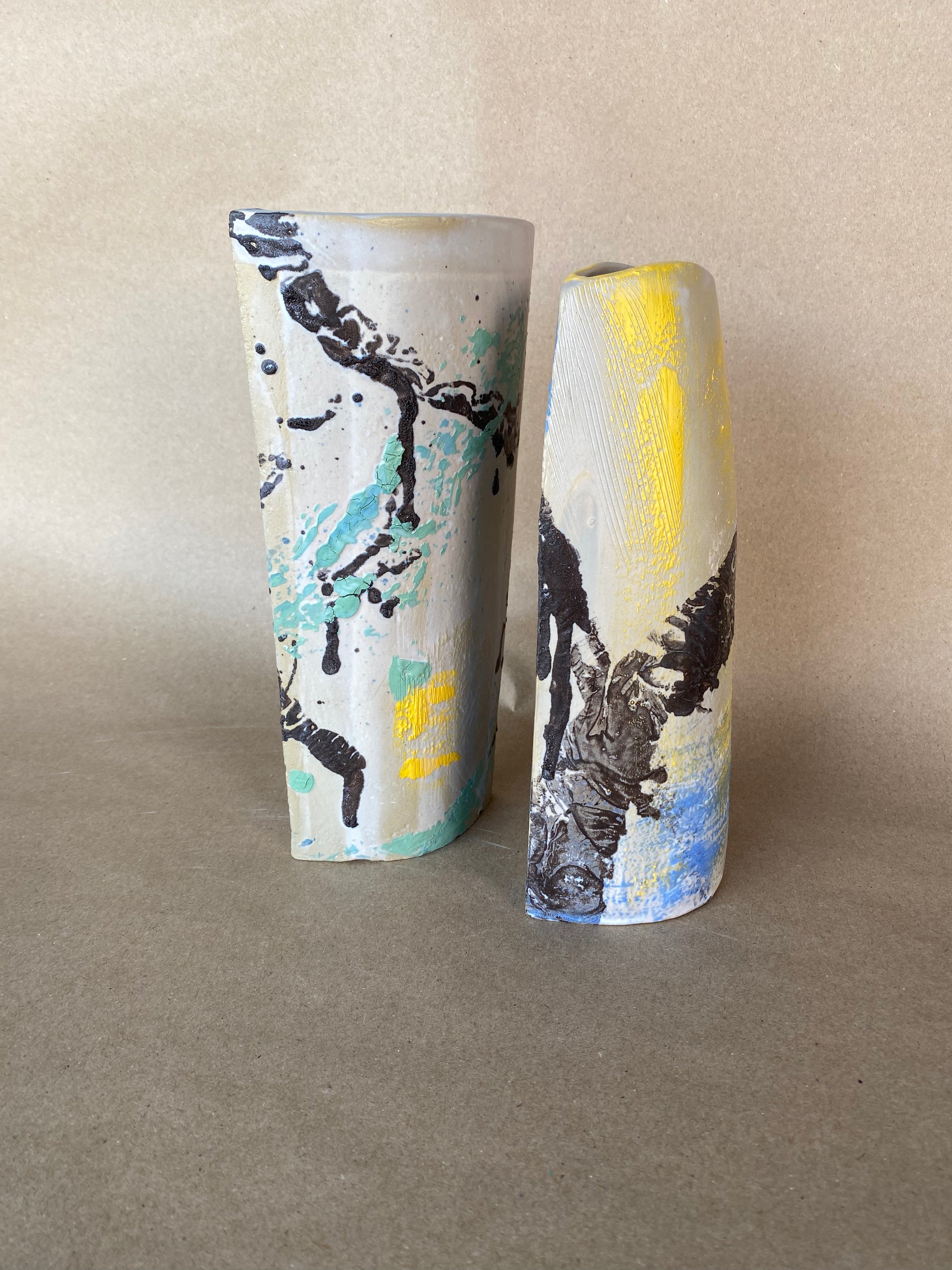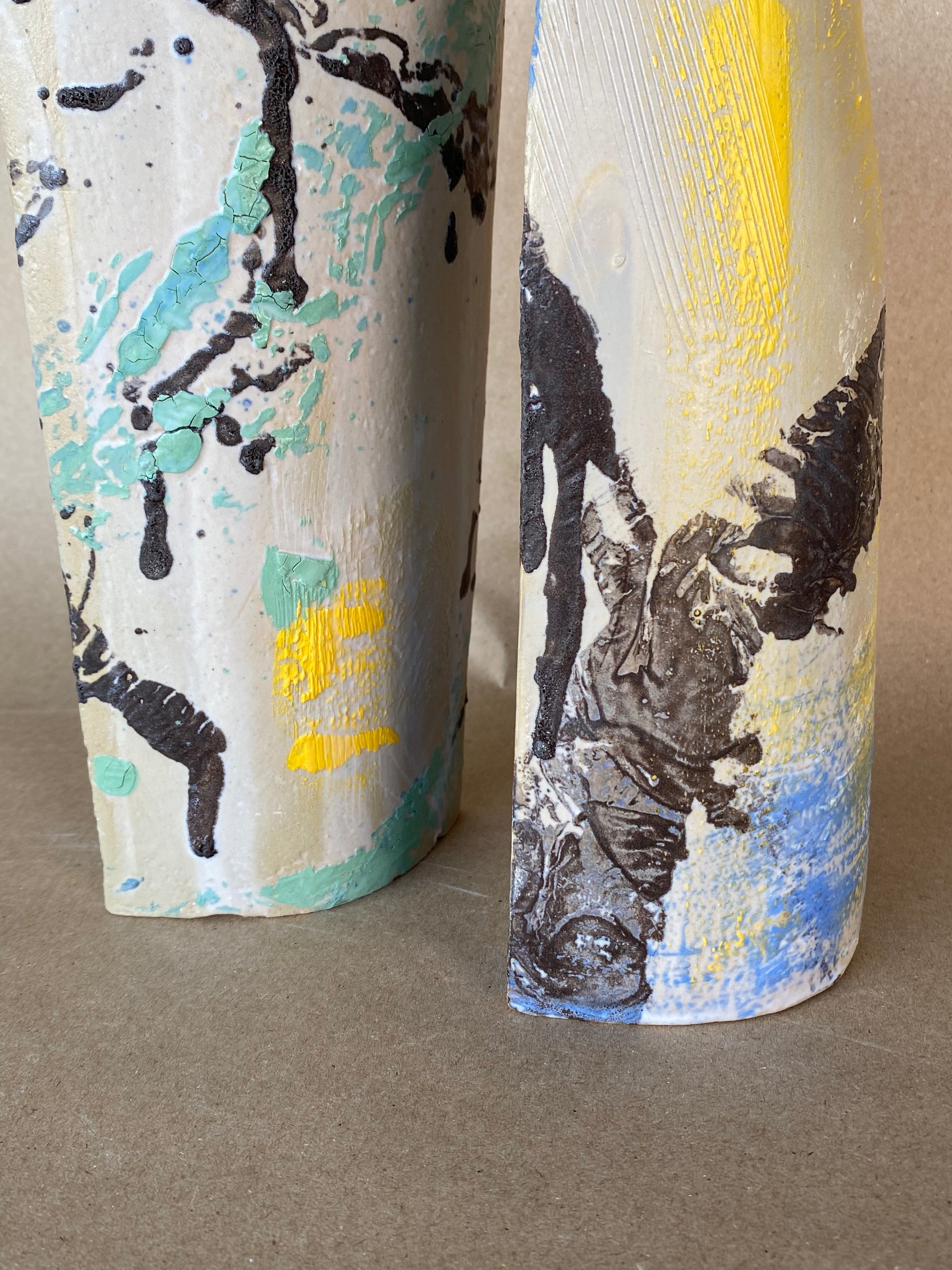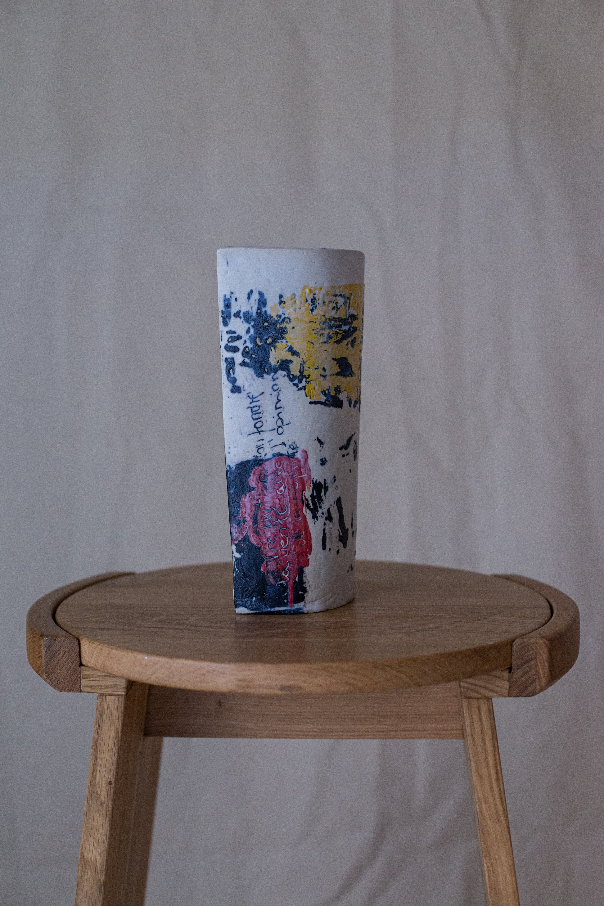Colección de piezas unicas realizadas en gres blanco. Pintadas de forma artesanal con colores primarios mediante diferentes técnicas. Todas las piezas son diferentes.