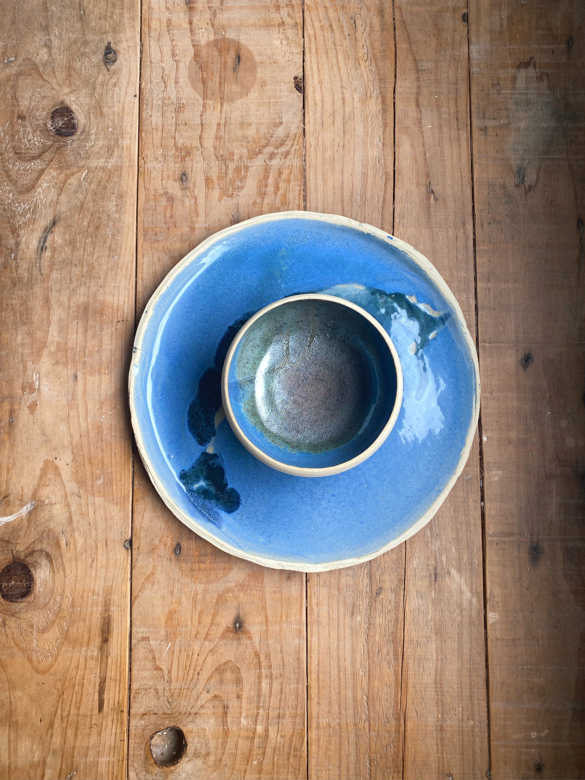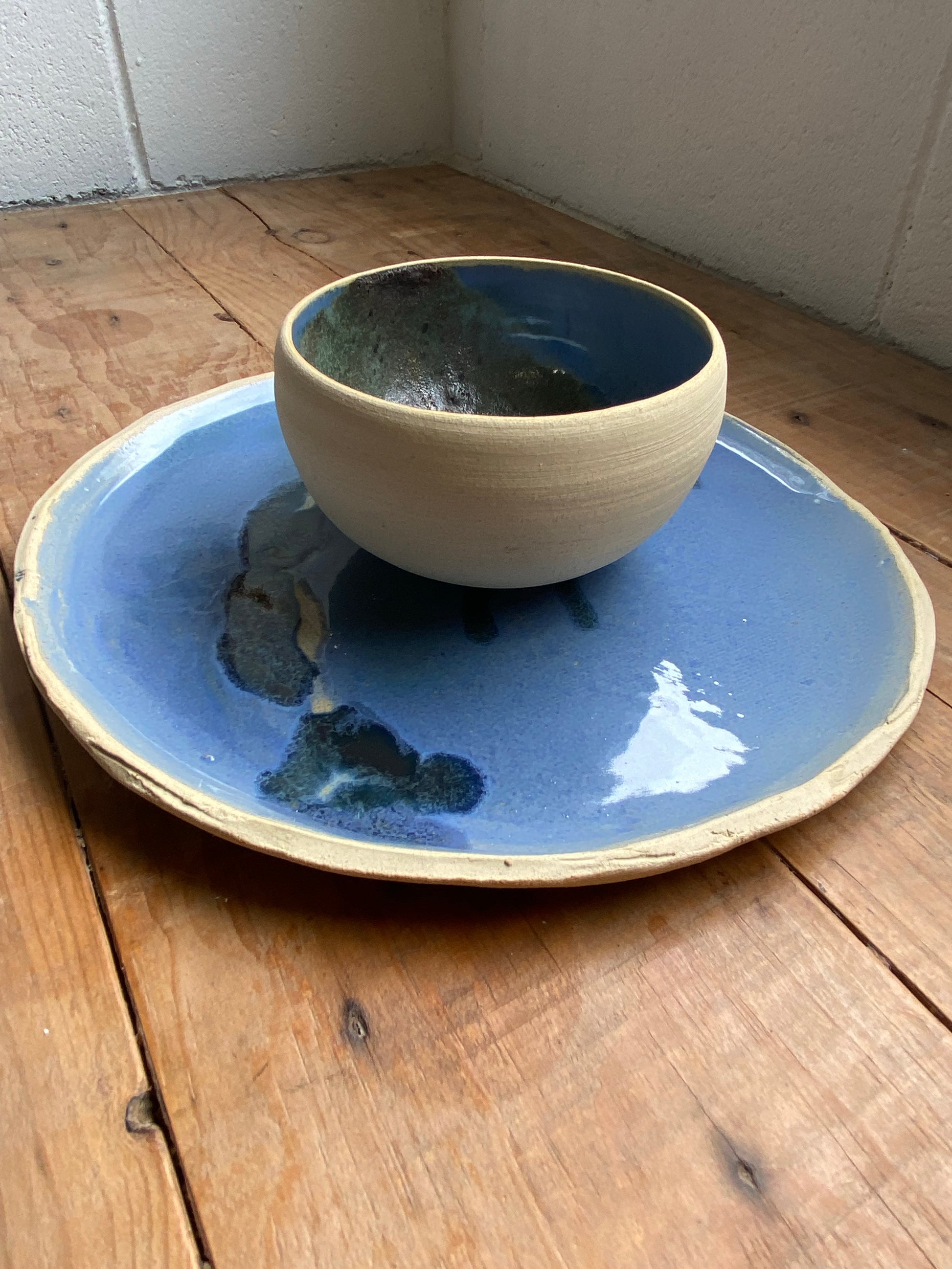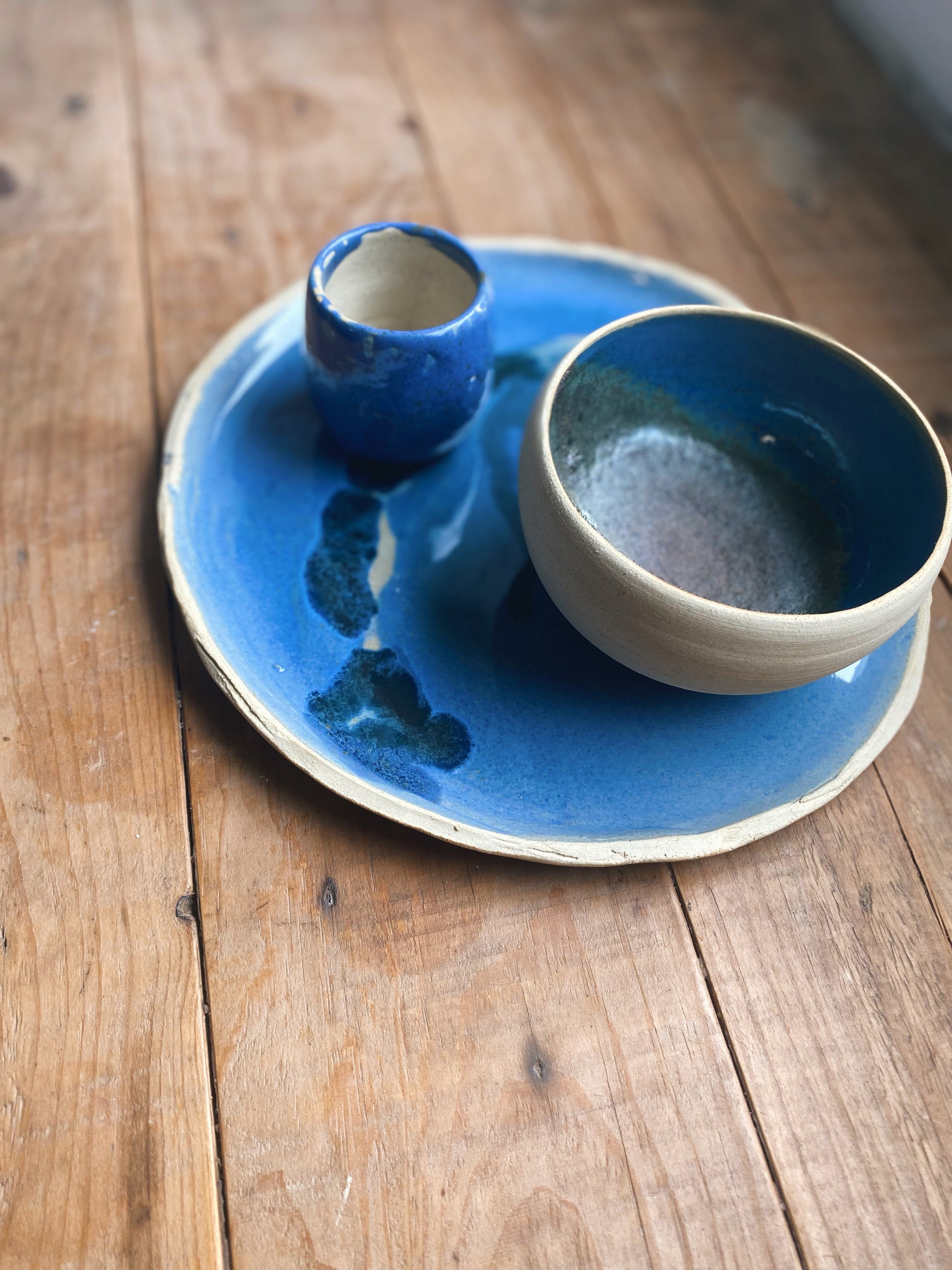 Pieza única hecha a mano en gres claro. Combínalo con el bol y el vaso azul ferruxe