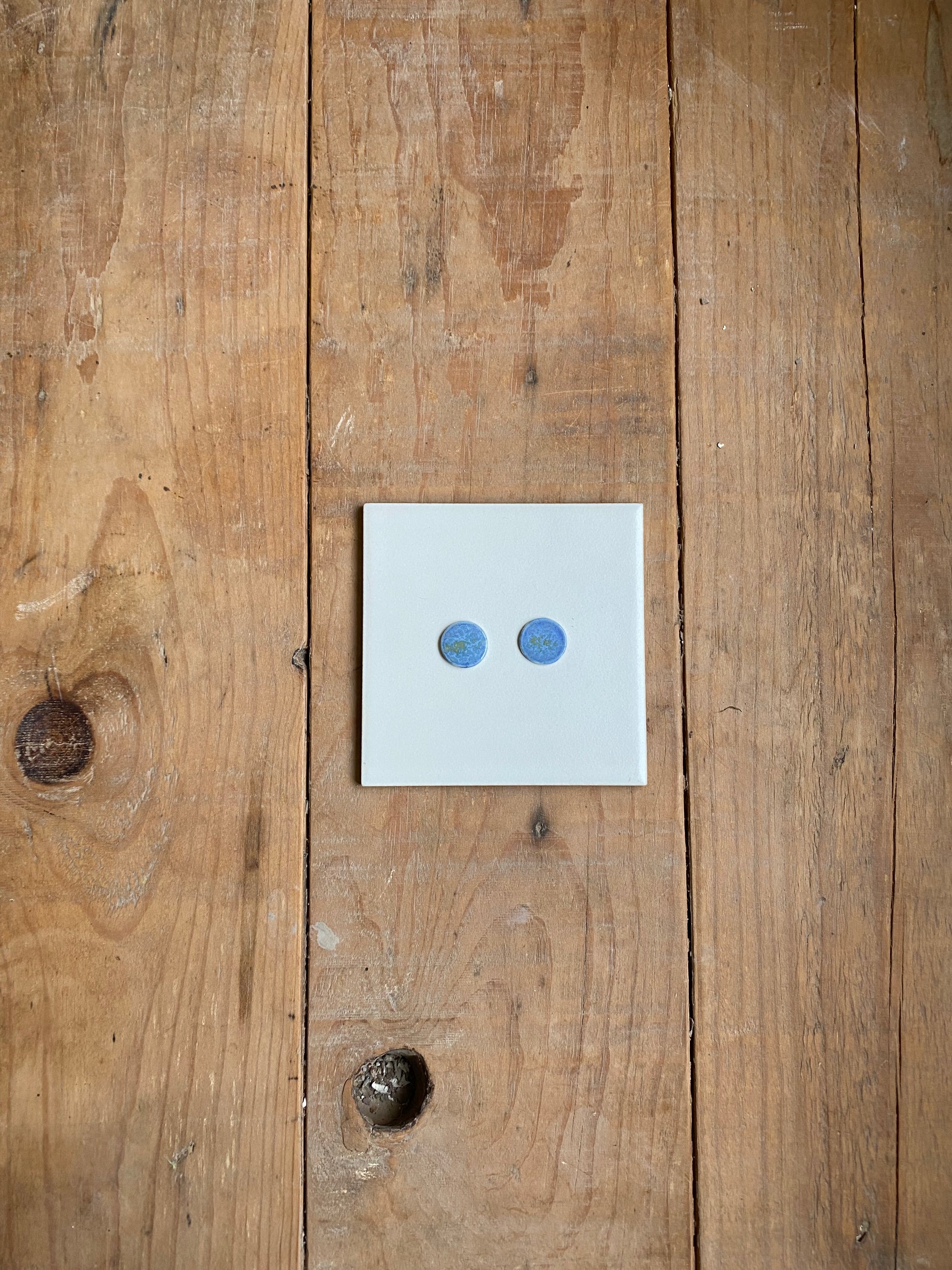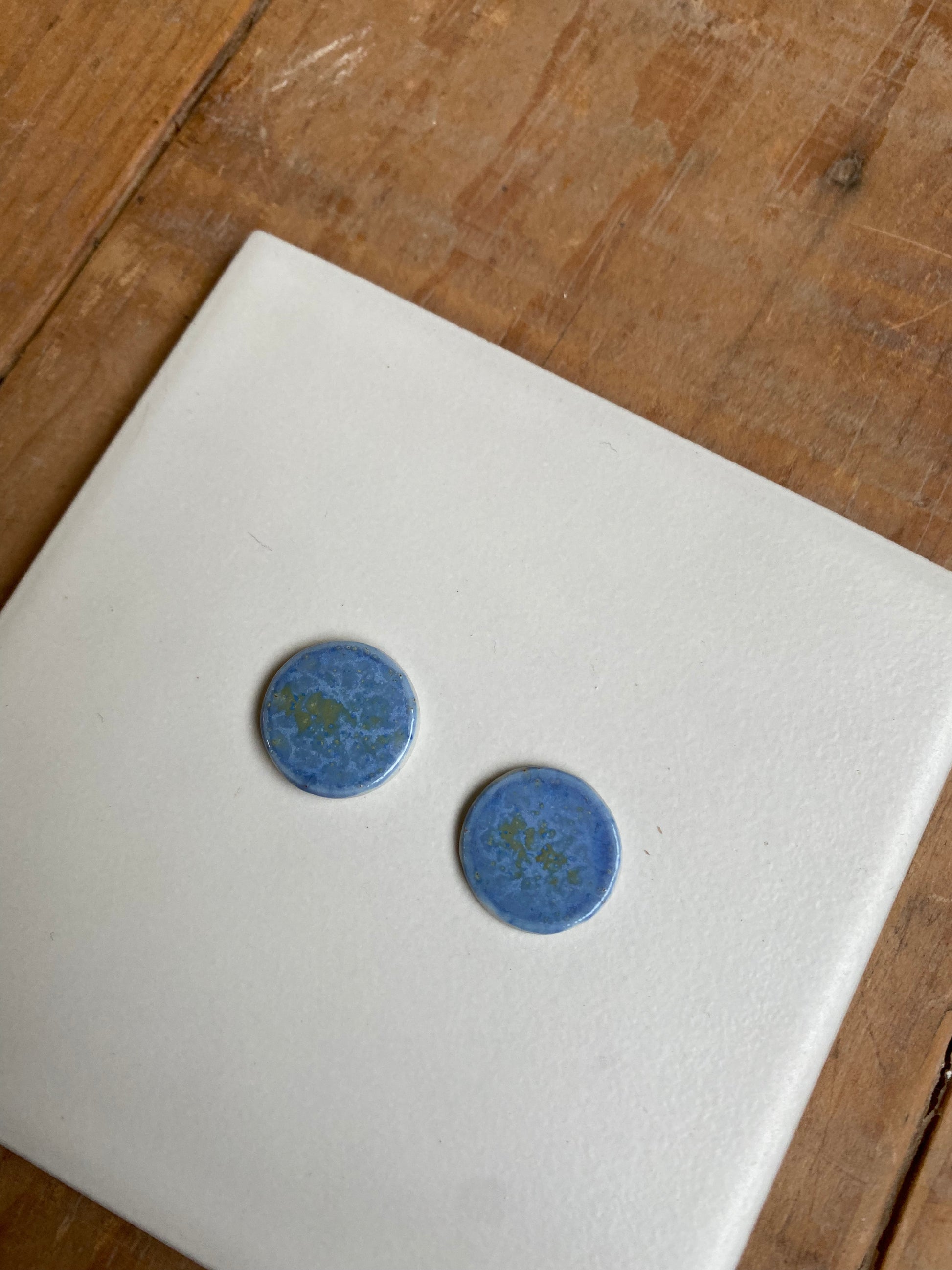 Pendientes hechos en porcelana blanca y negra con esmalte artesanal azul con tonos dorados.