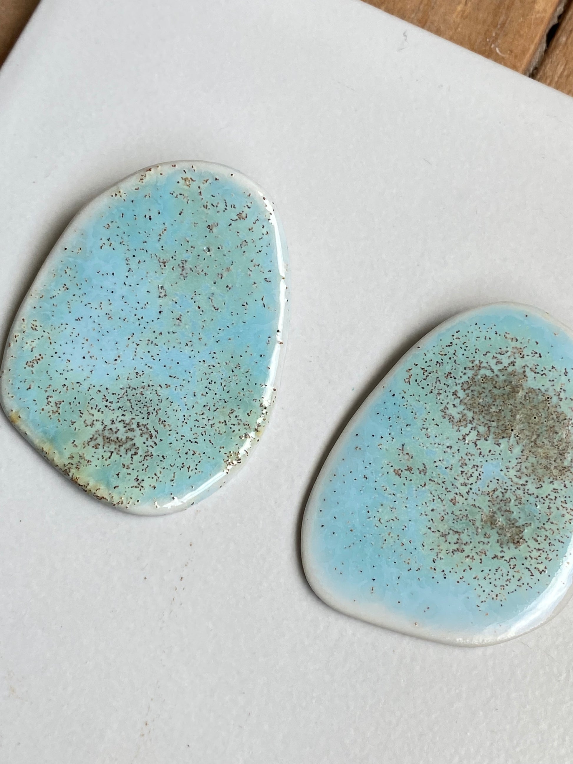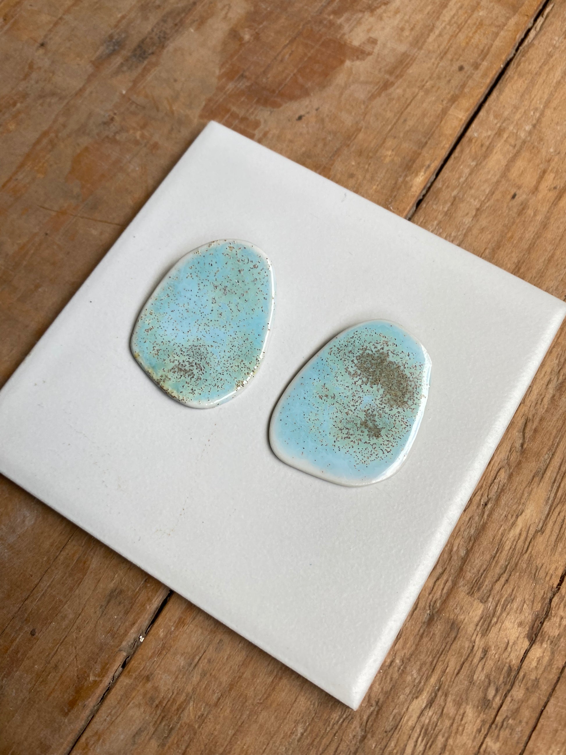 Pendientes hechos en porcelana blanca con esmalte artesanal color aguamarina.