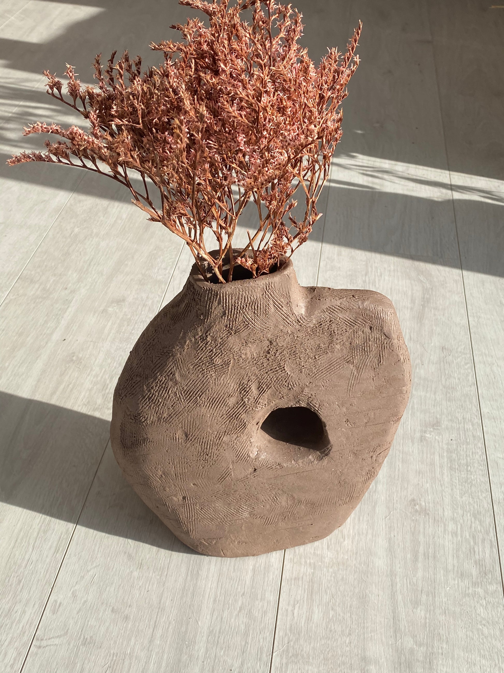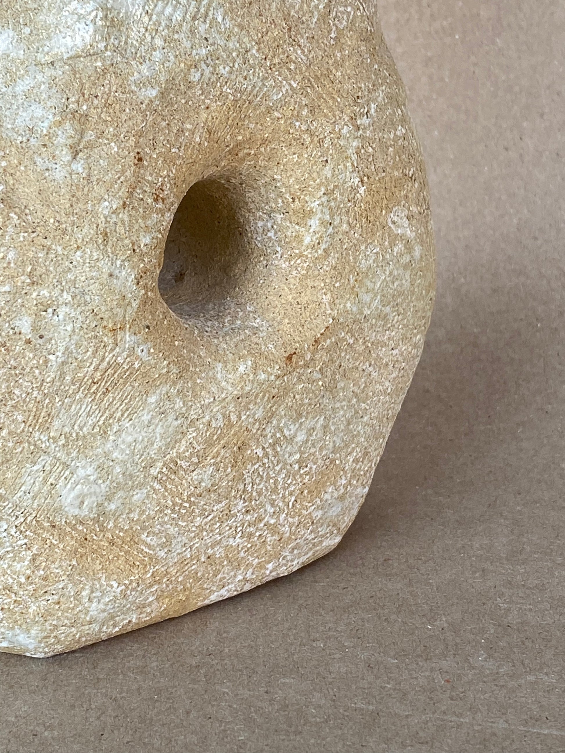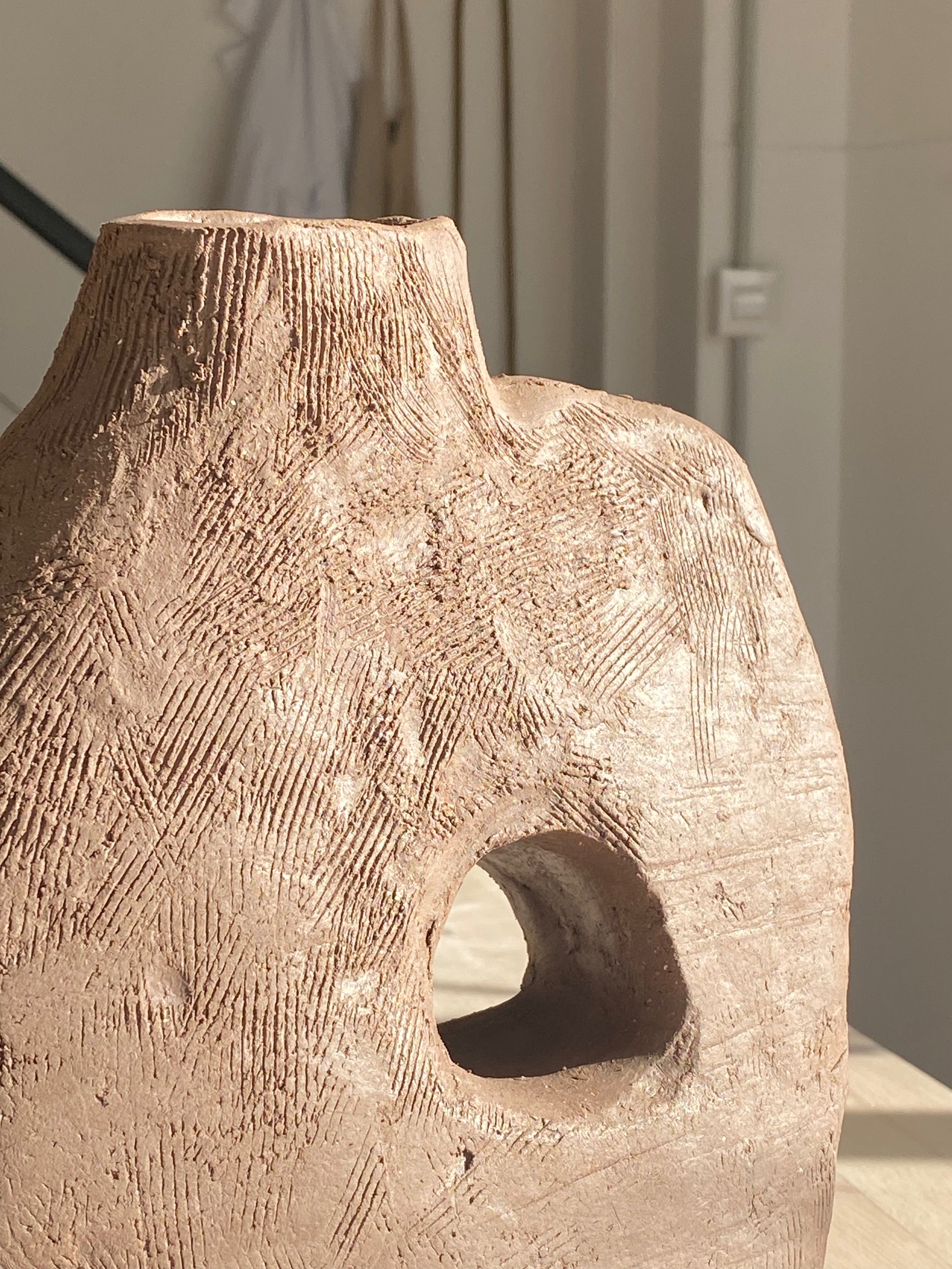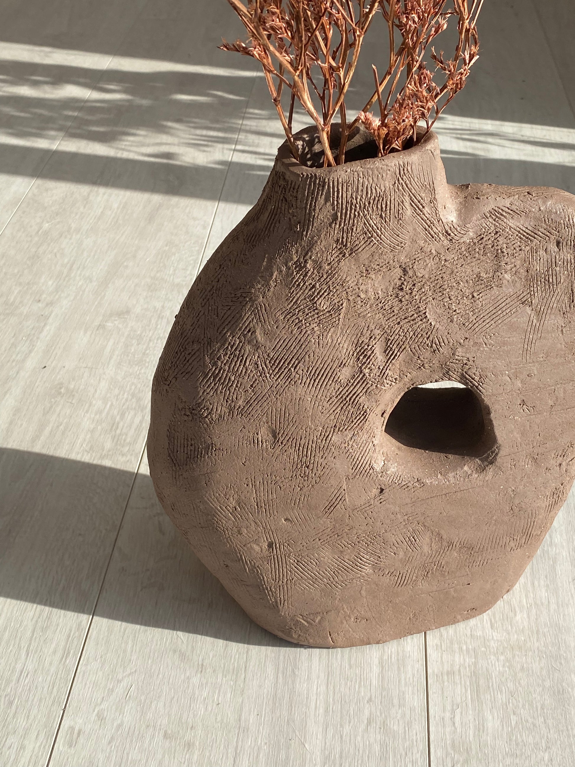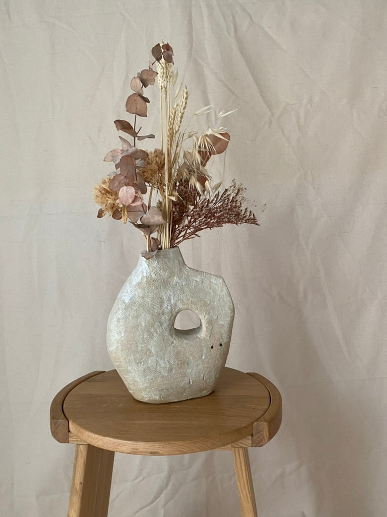 Pieza única realizada en gres tostado con textura y ligero esmaltado con blanco mate. Perfecta para decorar con flores