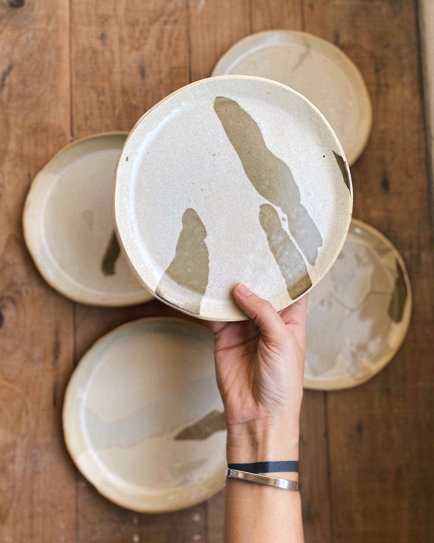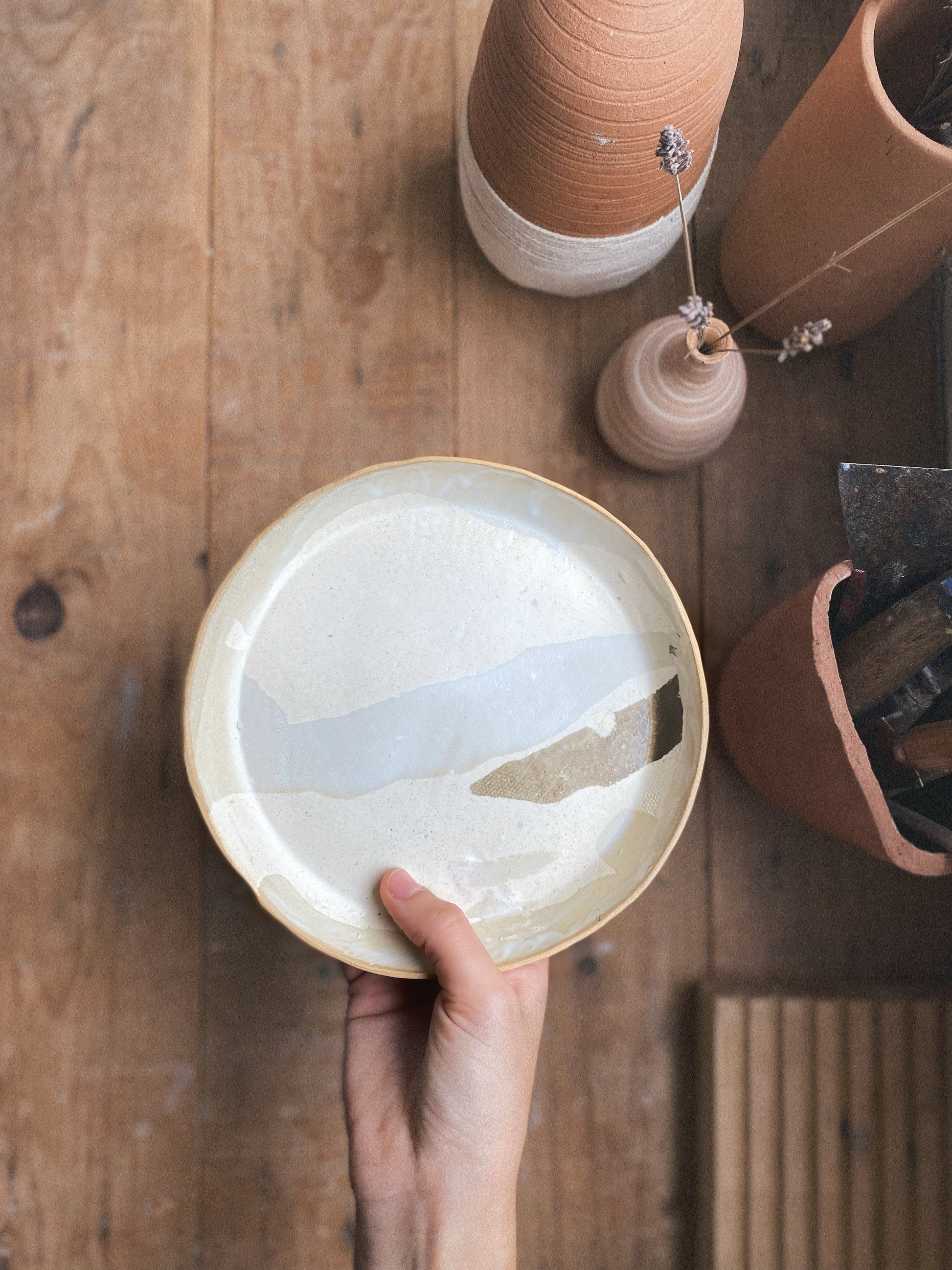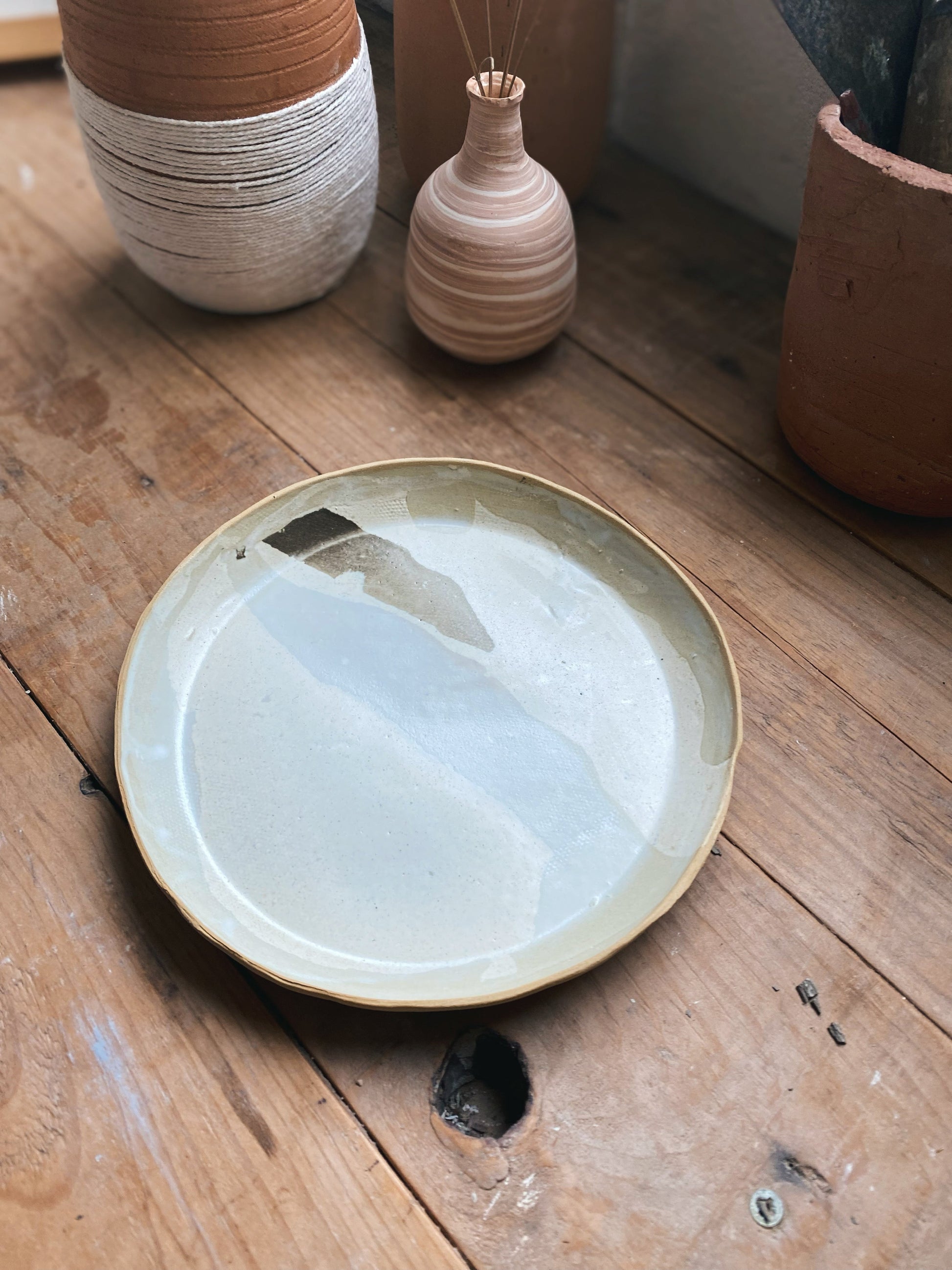 Plato pequeño hecho a mano con mezcla de gres blanco y negro .