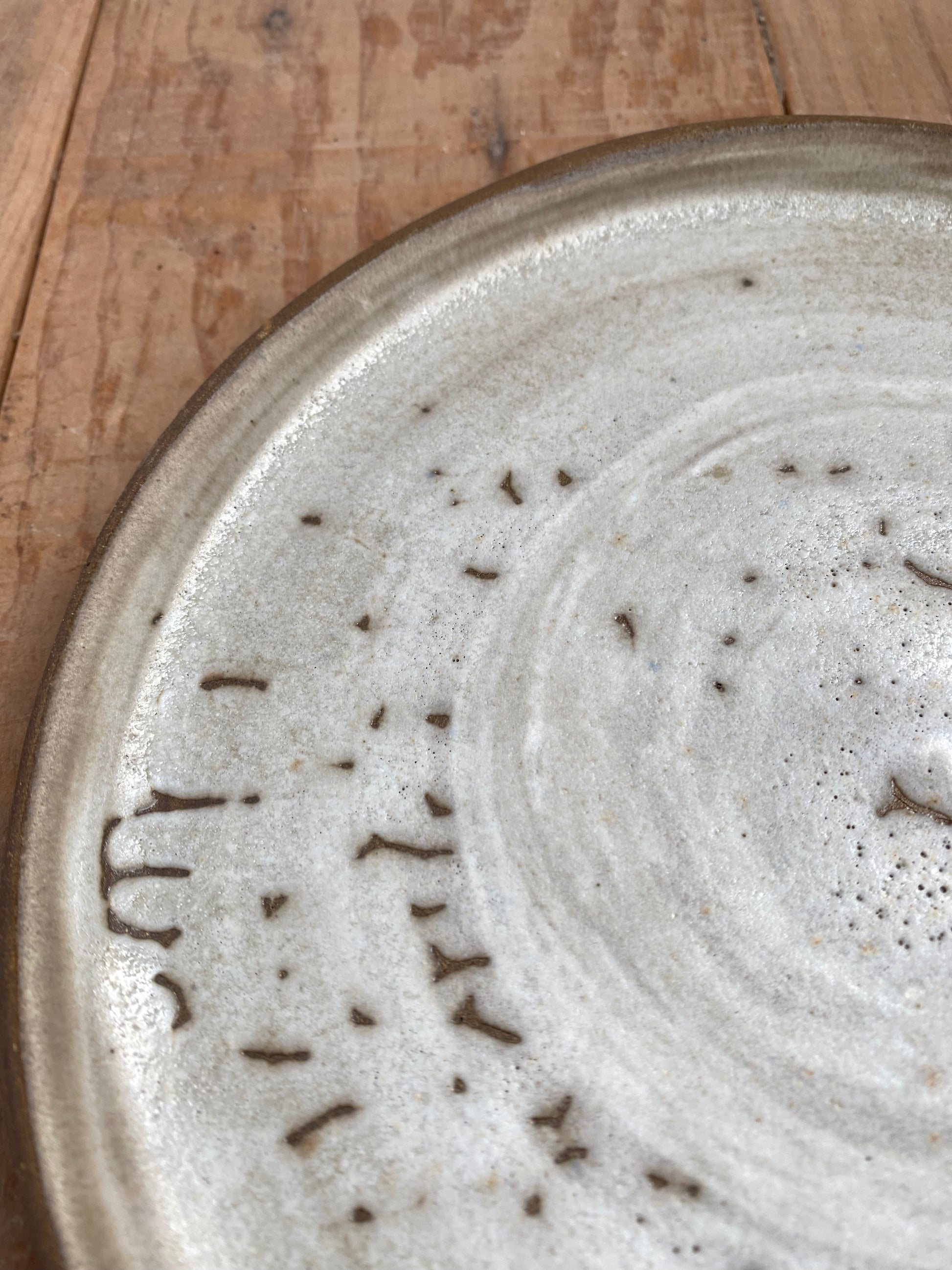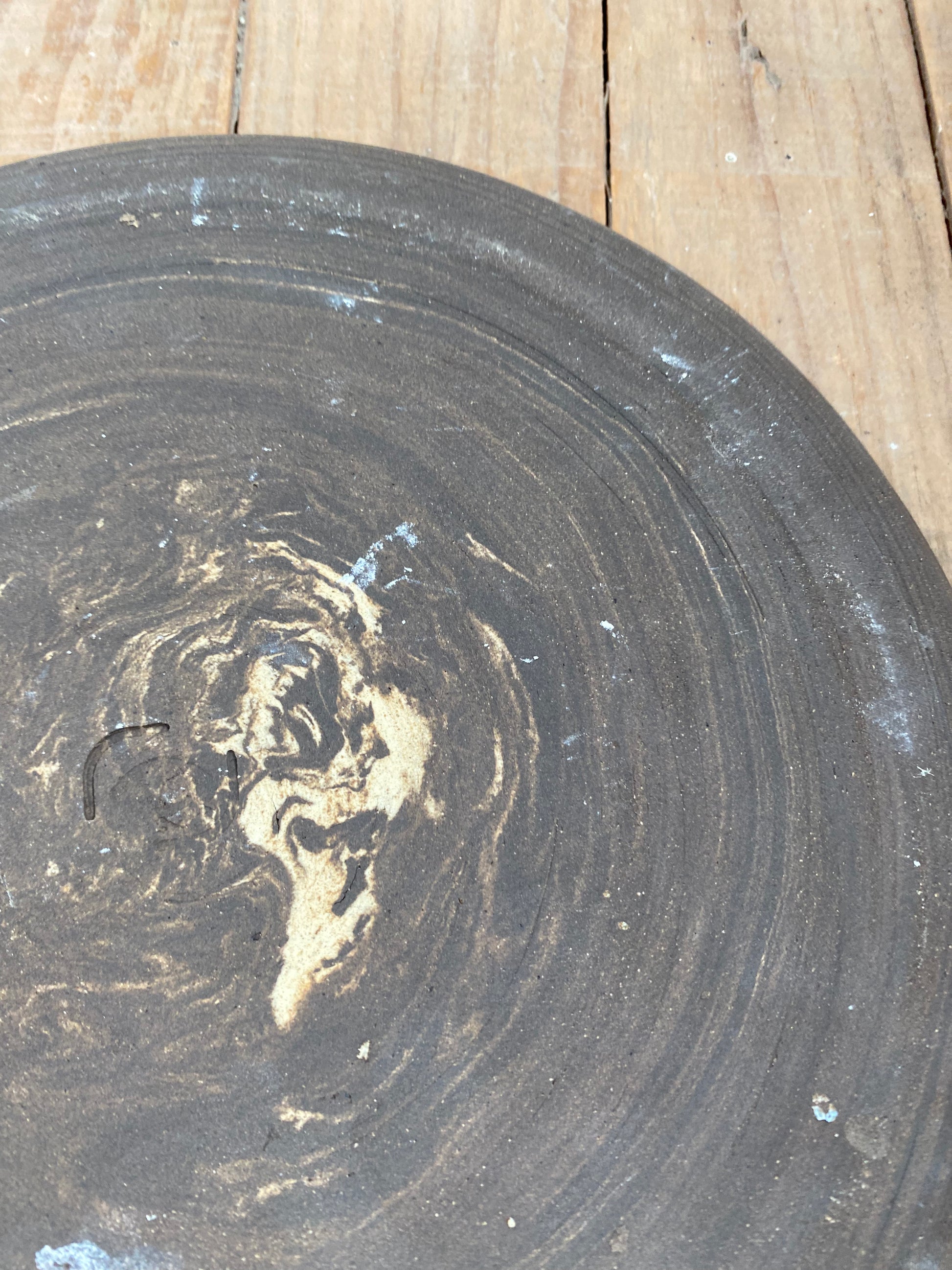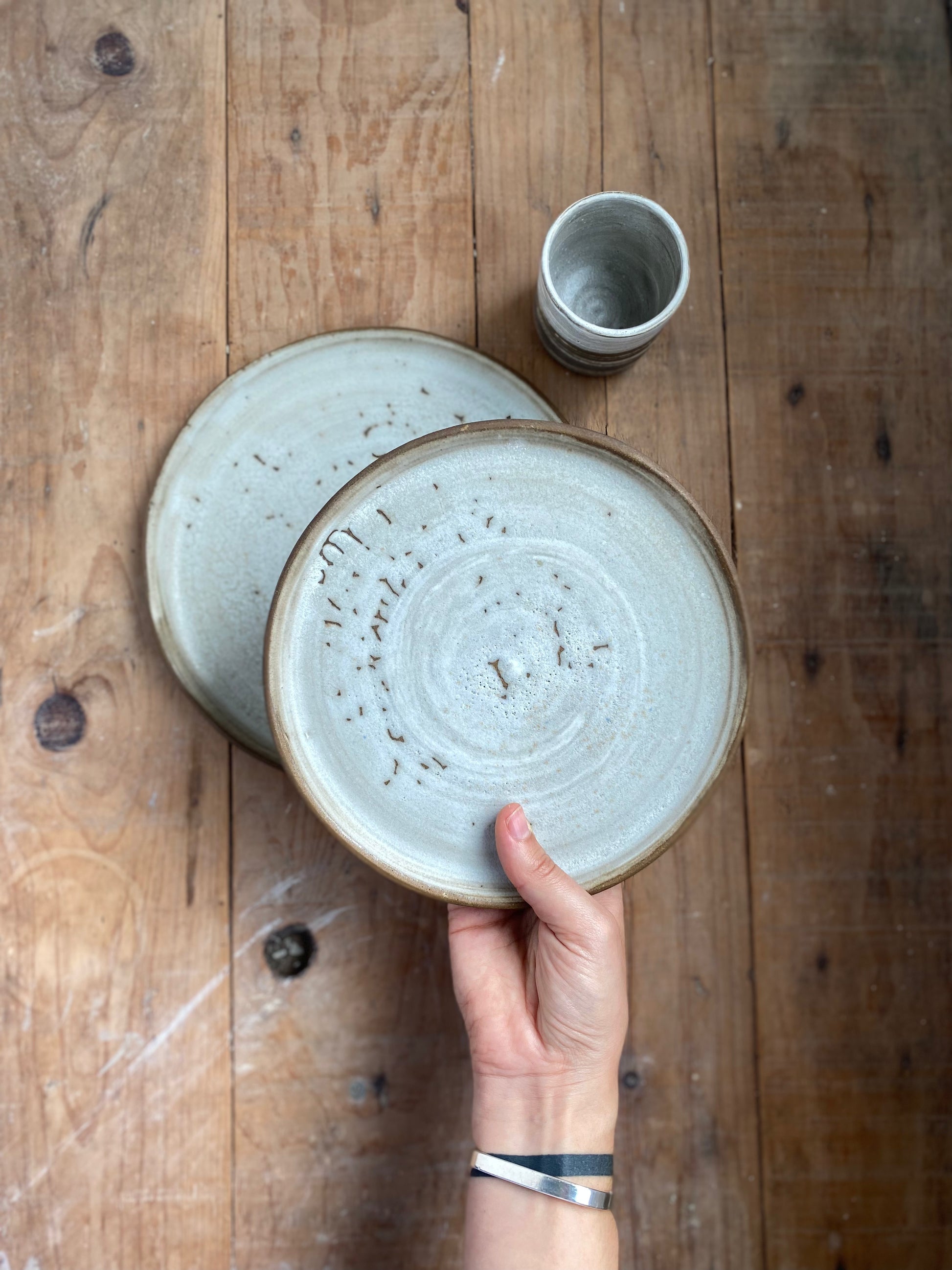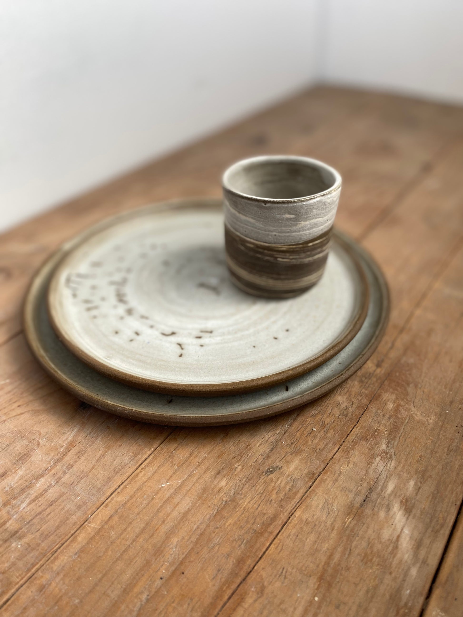Plato mediano hecho en torno con mezcla de gres negro y blanco. Combínalo con el plato Néboa L y el vaso Terra.