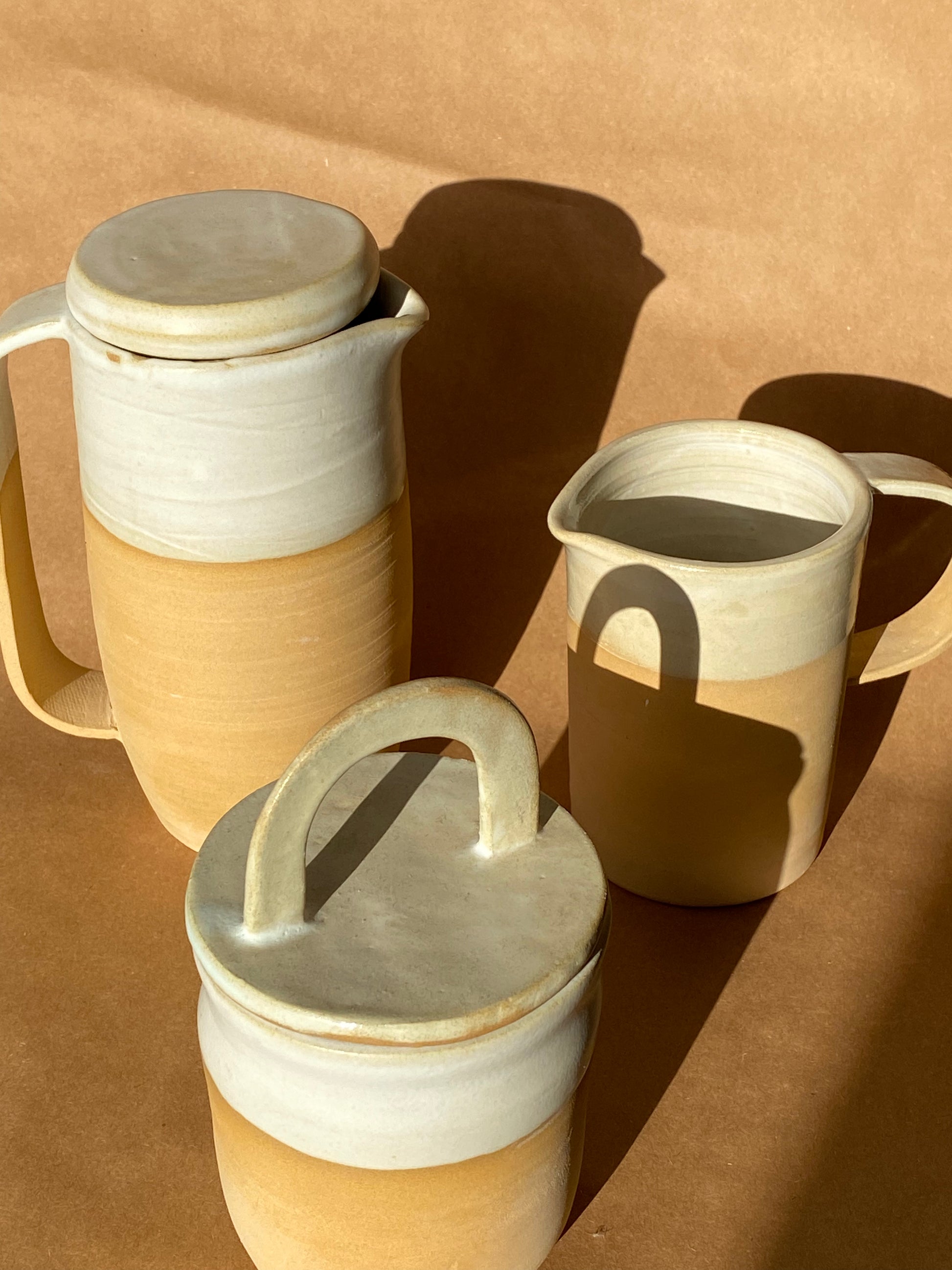 Set formado por jarra para el café, lechera y azucarera. Todas hechas en torno con gres tostado y esmalte artesanal blanco mate.