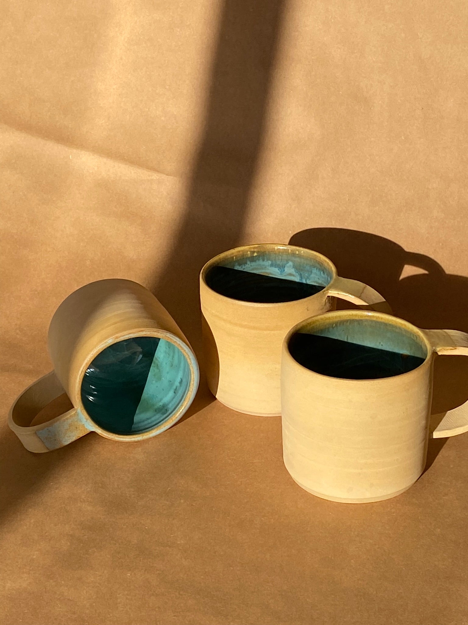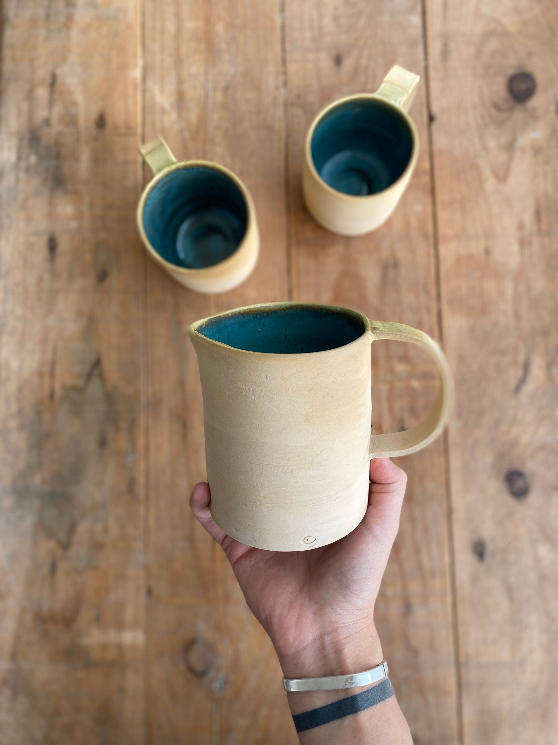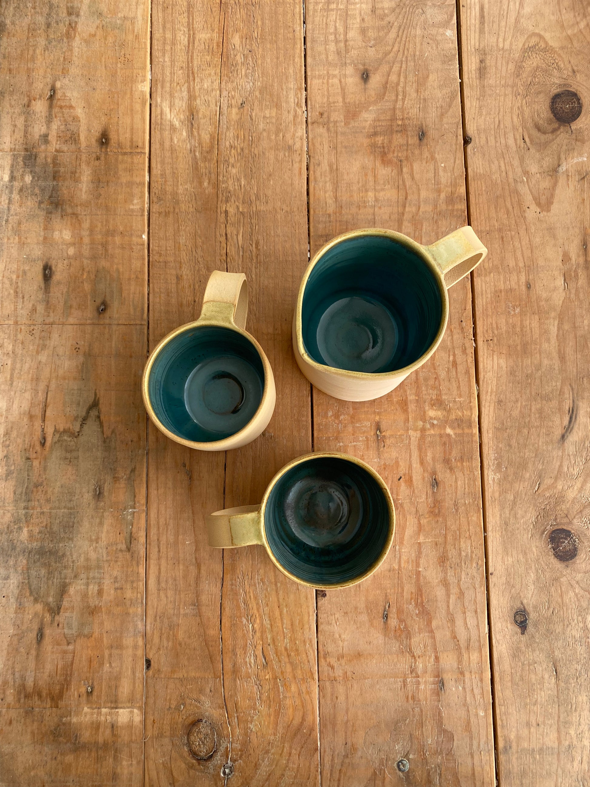 Set formado por 1 Jarra lechera y 2 Tazas hechas en torno con gres tostado y esmalte artesanal color turquesa.