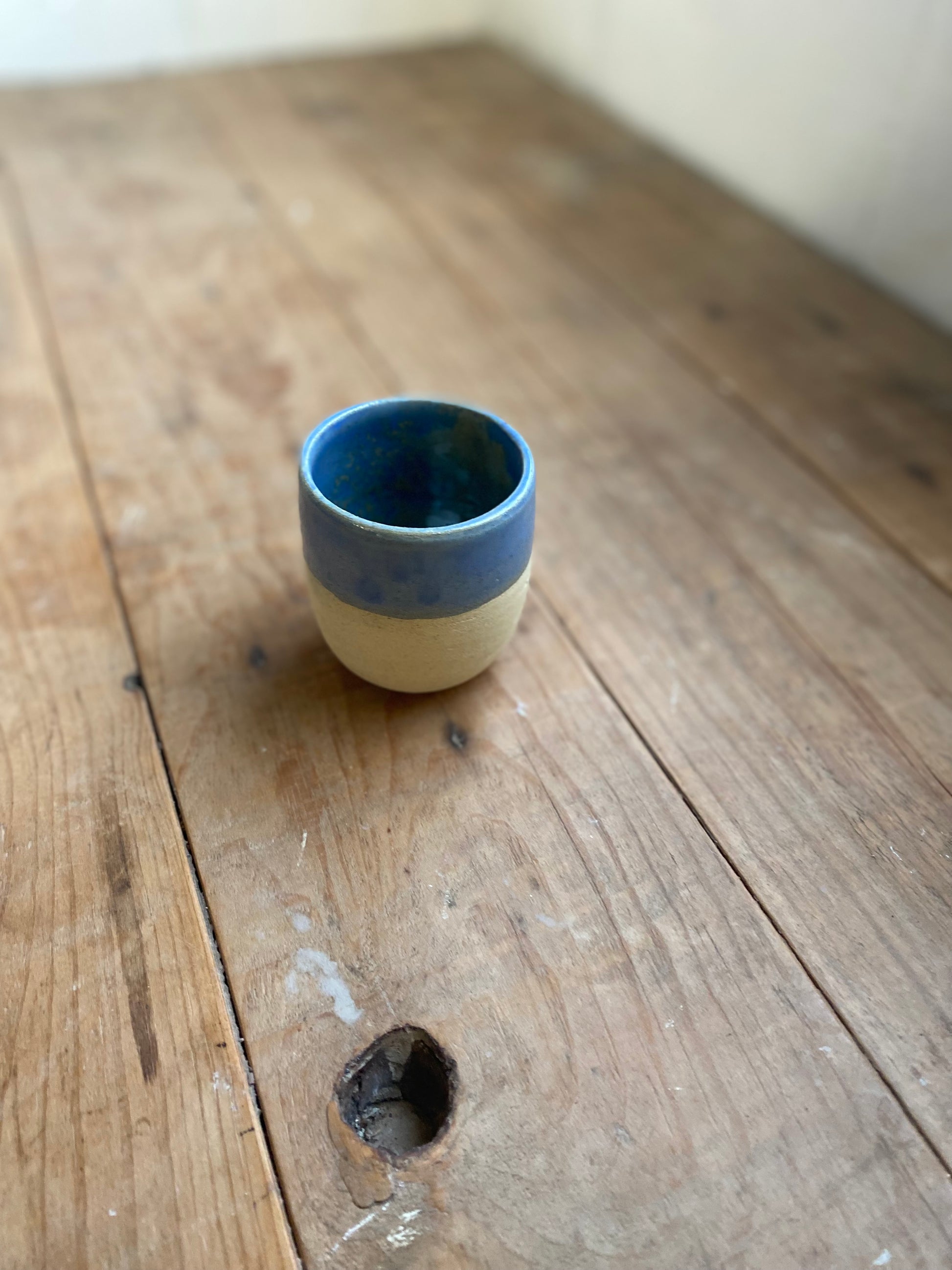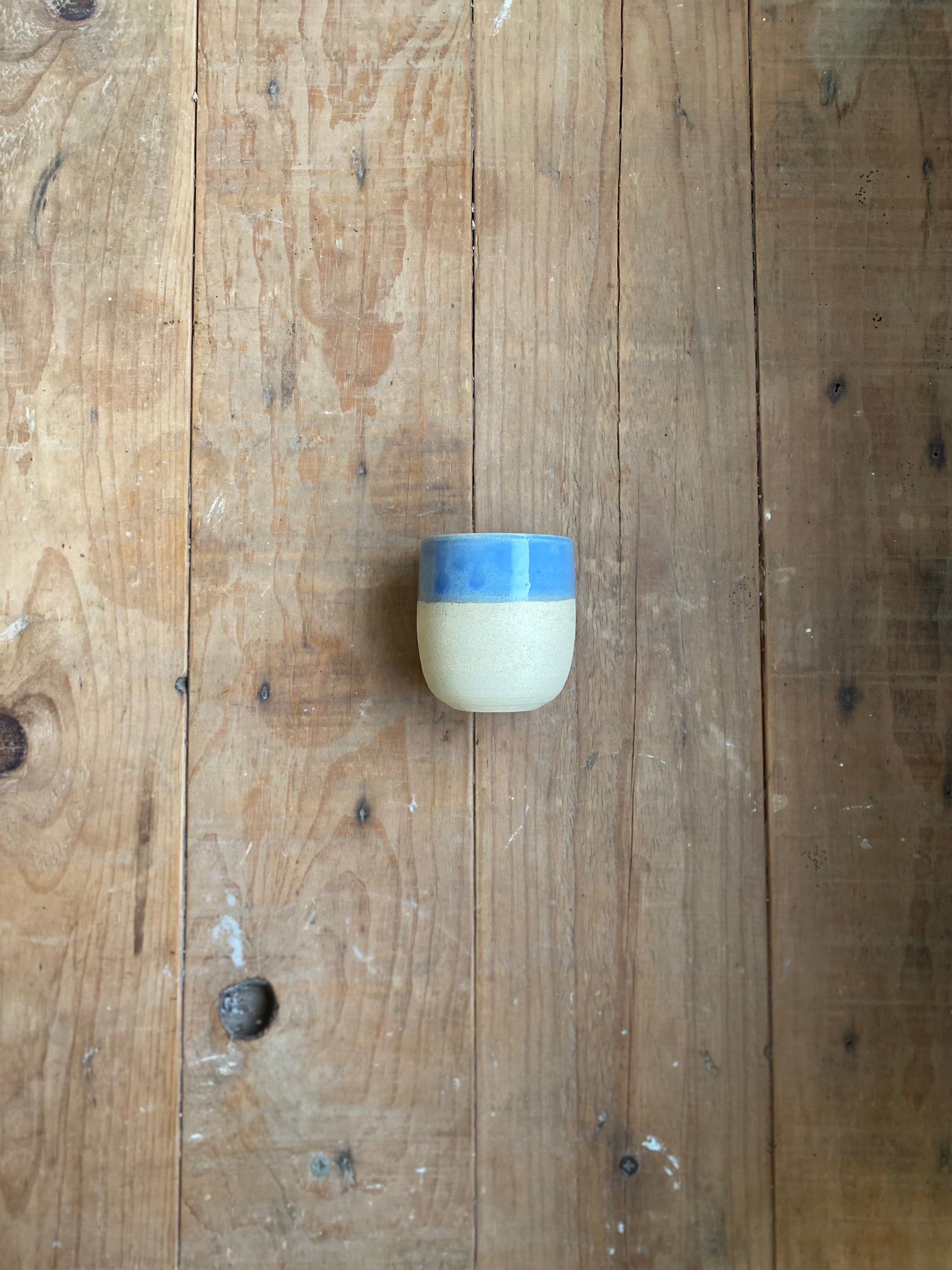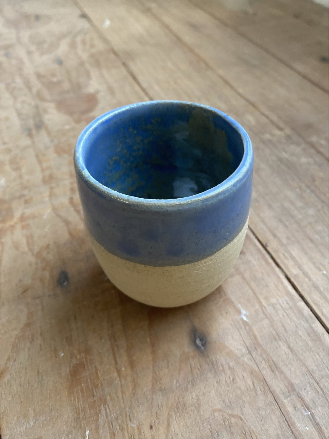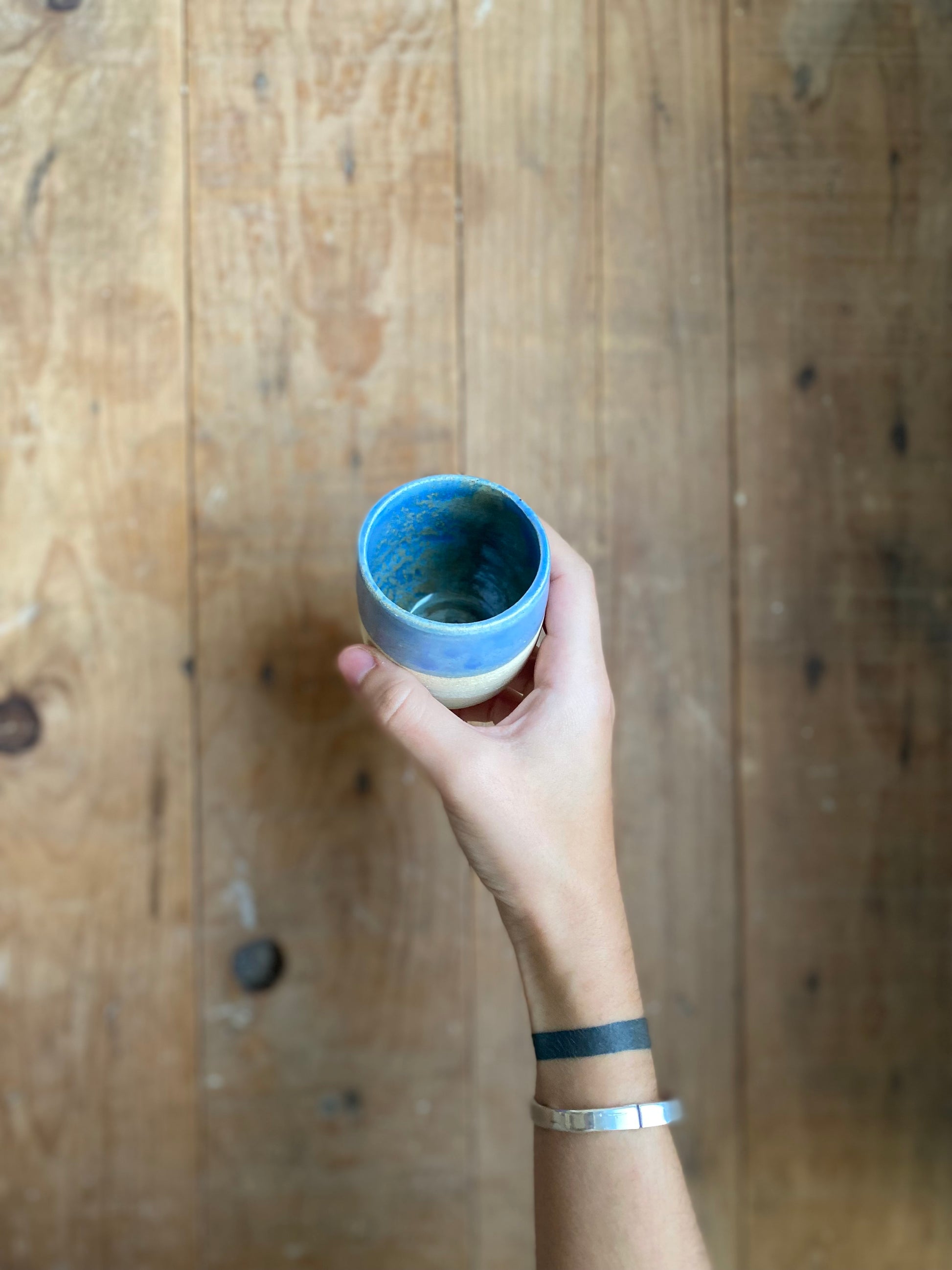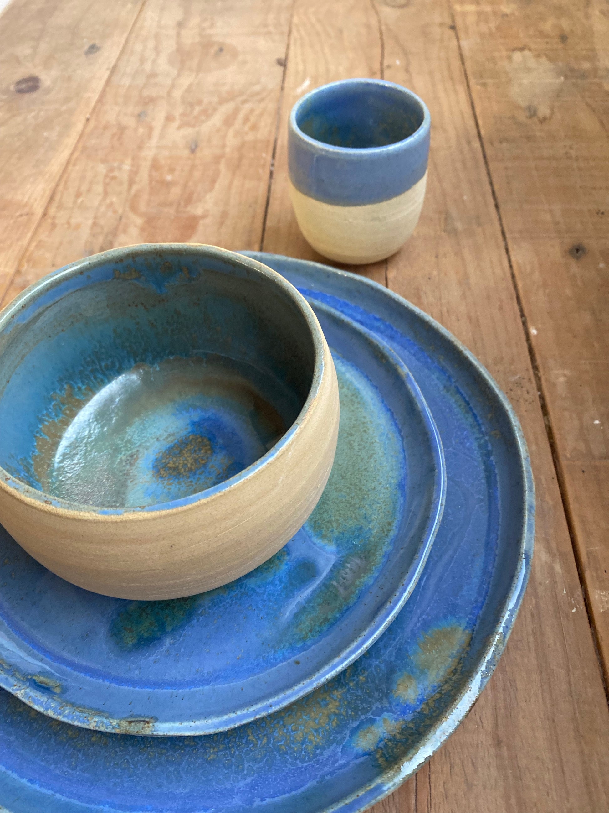 Bol hecho en torno en gres claro con esmalte artesanal color azul irregular.
